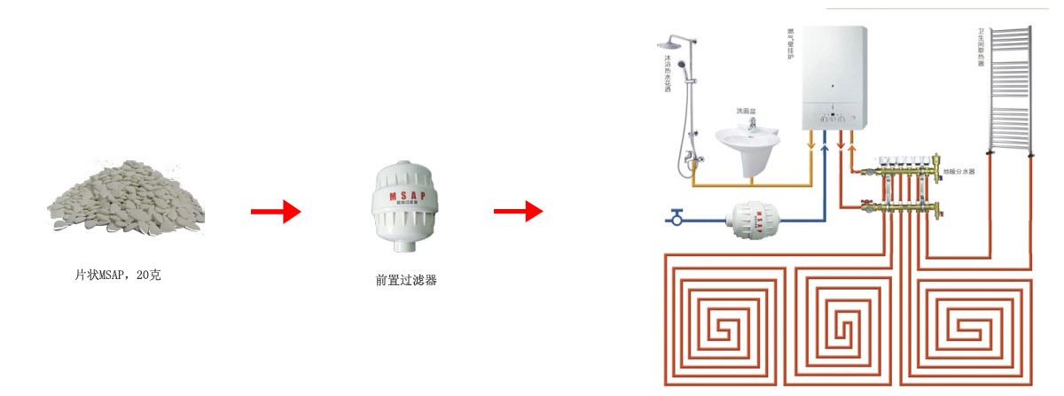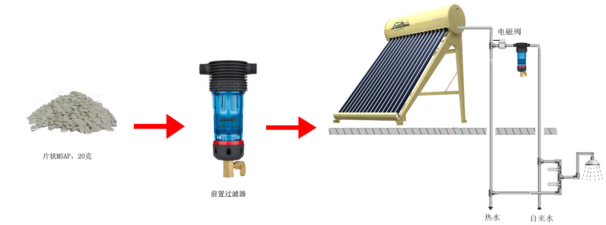 如果在電熱水器進水端增加一個含有MSAP的阻垢過濾裝置,可以有效解決水 垢問題。根據(jù)裝置大小,可以滿足30-60噸水處理量,確保電熱水器在半年至一年 使用。